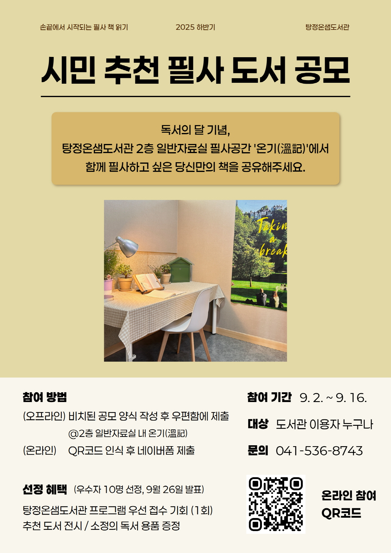 아산시 탕정온샘도서관, 2025 하반기 시민 추천 필사 도서 공모