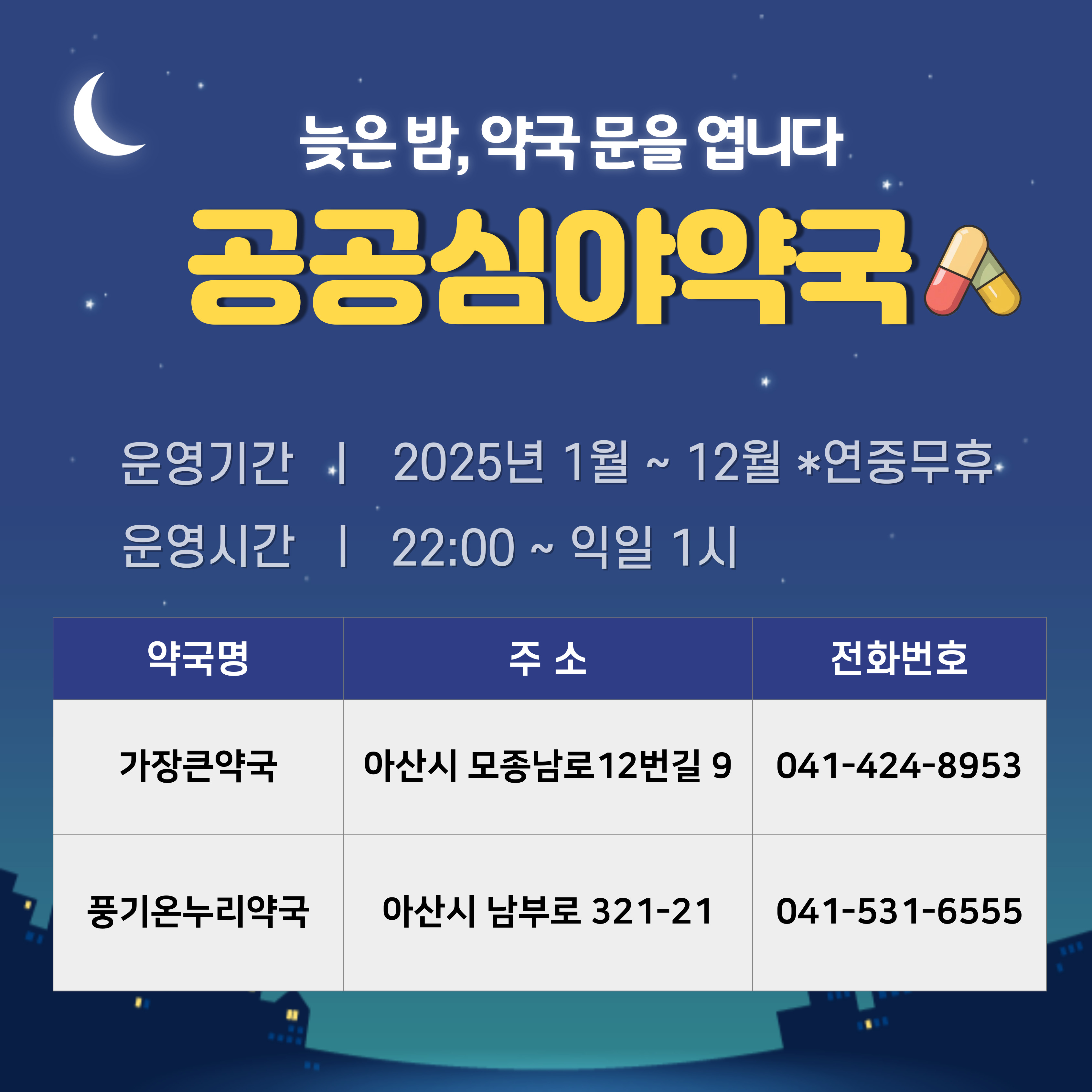 올해 지정된 공공심야약국은 △가장큰약국(아산시 모종남로12번길 9) △풍기온누리약국(아산시 남부로 321-21) 총 2개소로, 밤 10시부터 익일 오전 1시까지 운영된다. 또한, 주말과 공휴일, 명절에도 운영되어 언제든지 의약품 구매가 가능하다.