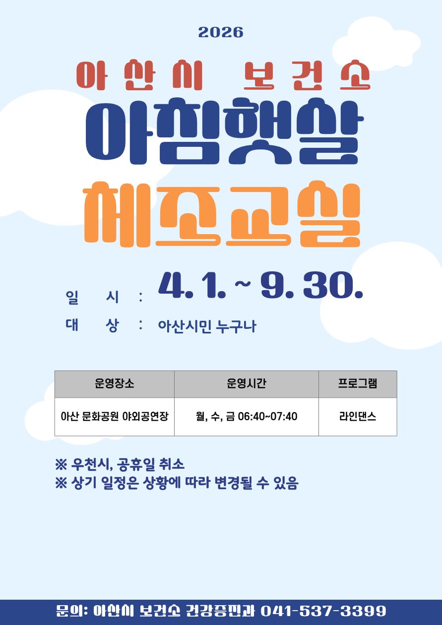아산시보건소(소장 최원경)는 오는 4월 1일부터 9월 30일까지 시민들의 건강한 일상 실천을 돕기 위해 아침과 저녁 시간대에 ‘2026년 건강체조교실’을 운영한다.