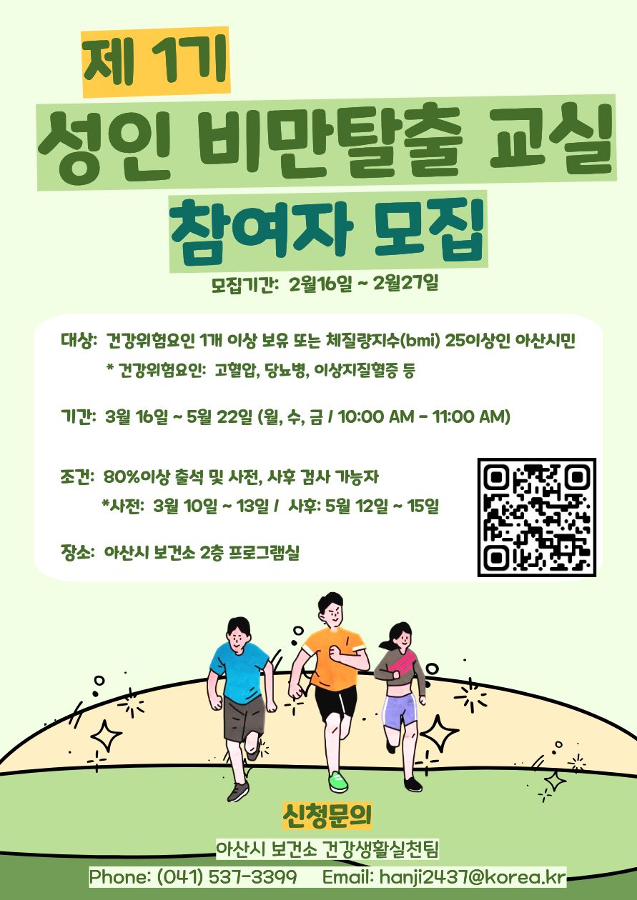 아산시 보건소(소장 최원경)는 2월 16일부터 2월 27일까지 성인을 대상으로 비만 예방과 건강 증진을 위한 ‘성인비만탈출교실’ 참여자를 모집한다.