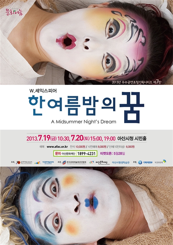 문화체육관광부, 한국문화예술위원회가 주최하고 한국문화예술회관연합회가 주관하는 “지역문예회관 우수공연 프로그램 지원사업”에 우리 아산시는 (재)아산문화재단과 아산시평생학습관 공동주관으로 두 편의 우수공연프로그램을 신청하여 최종 선정되었다. 그 첫 번째 공연으로 7월 19일(금)~20일(토) 총2일3회 공연하는 ‘극단 여행자’의 한국판 셰익스피어 <한 여름 밤의 꿈>이, 두 번째 작품으로 <퓨전국악콘서트 공감 21>이 올 12월14일(토) 총1일 2회 공연으로 아산 무대를 장식할 예정이다.